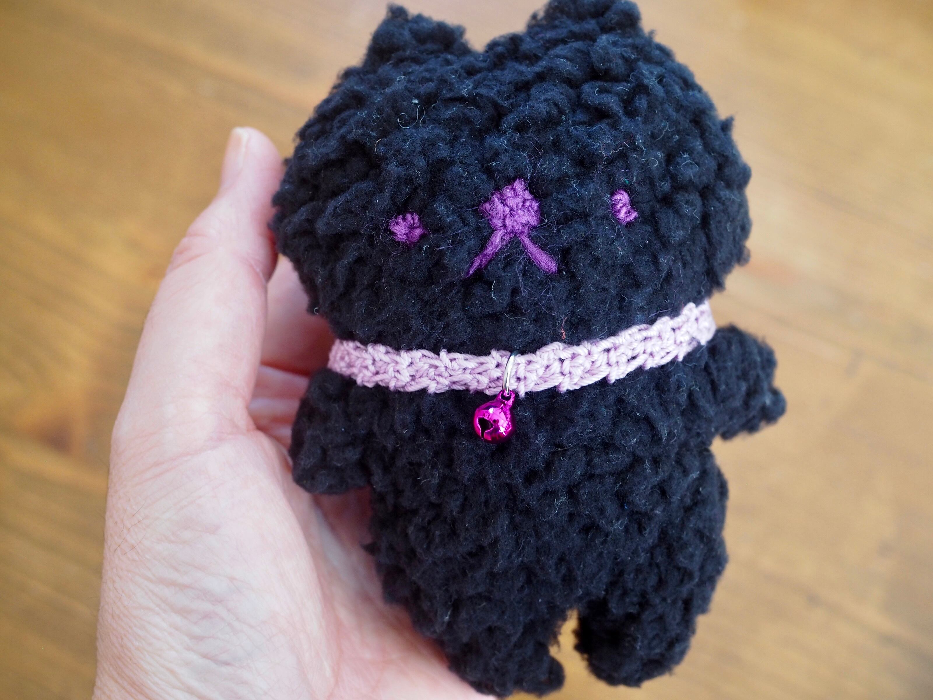 首輪は淡い紫色、鈴が鮮やかな赤紫、目鼻はむらさき色の糸を使用しています。