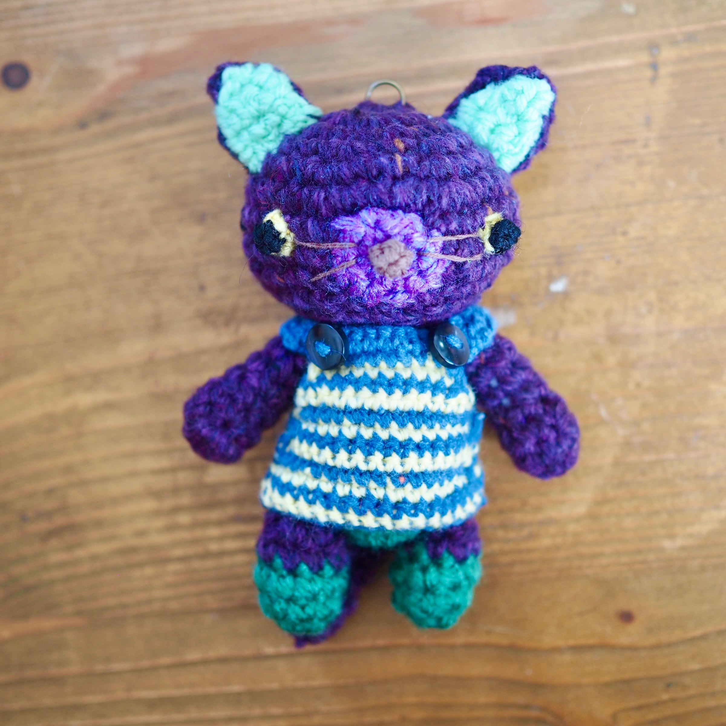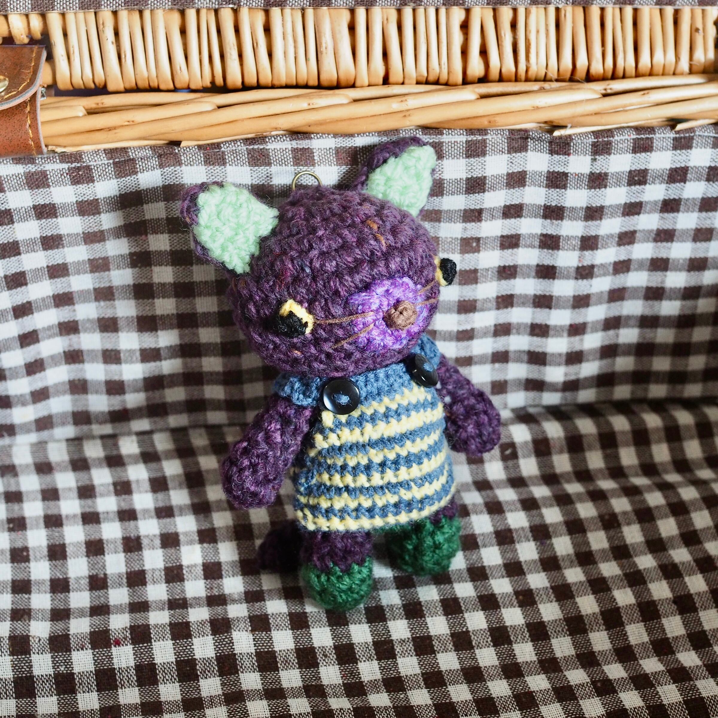 深いむらさき色のネコの編みぐるみです。