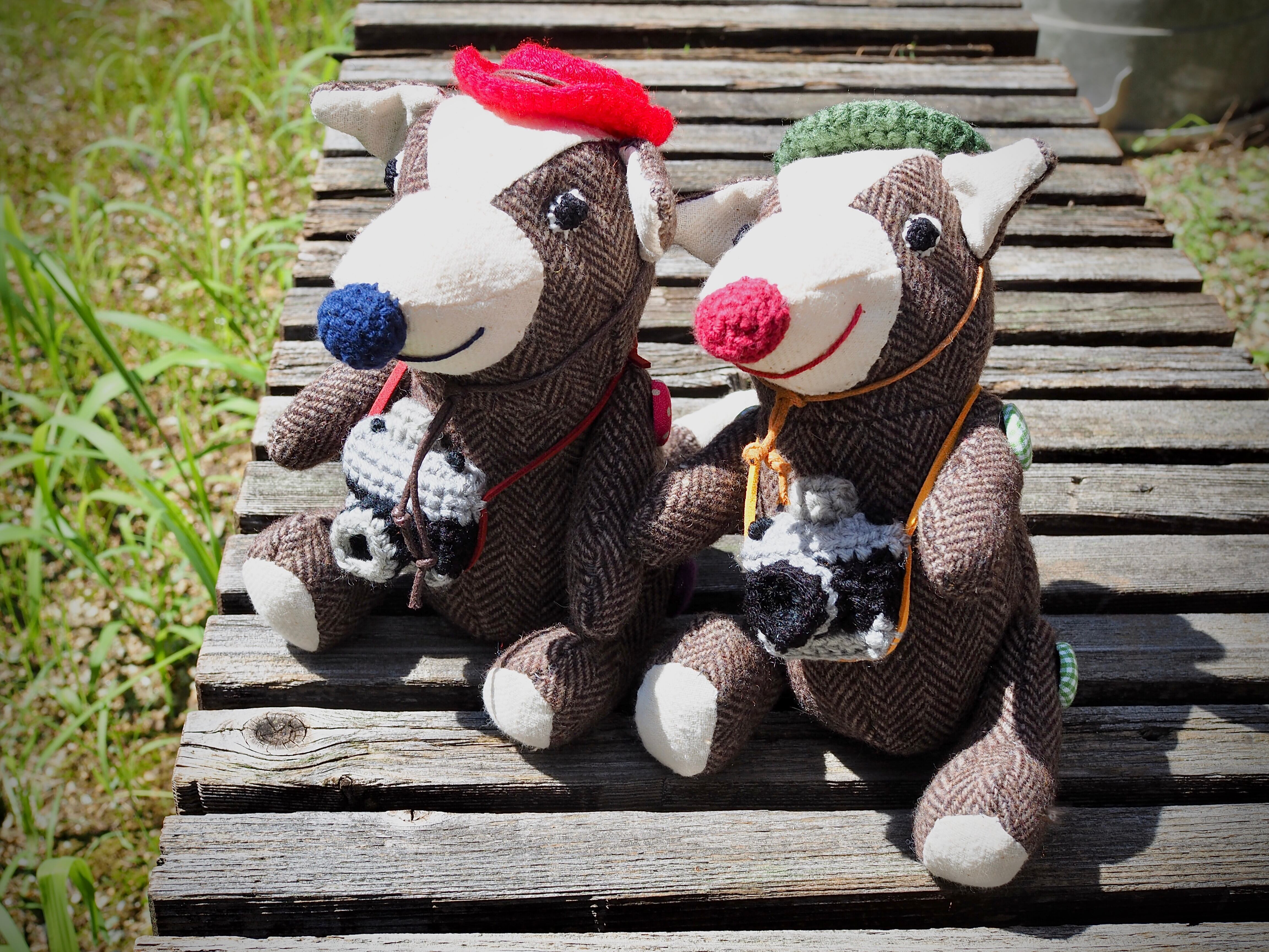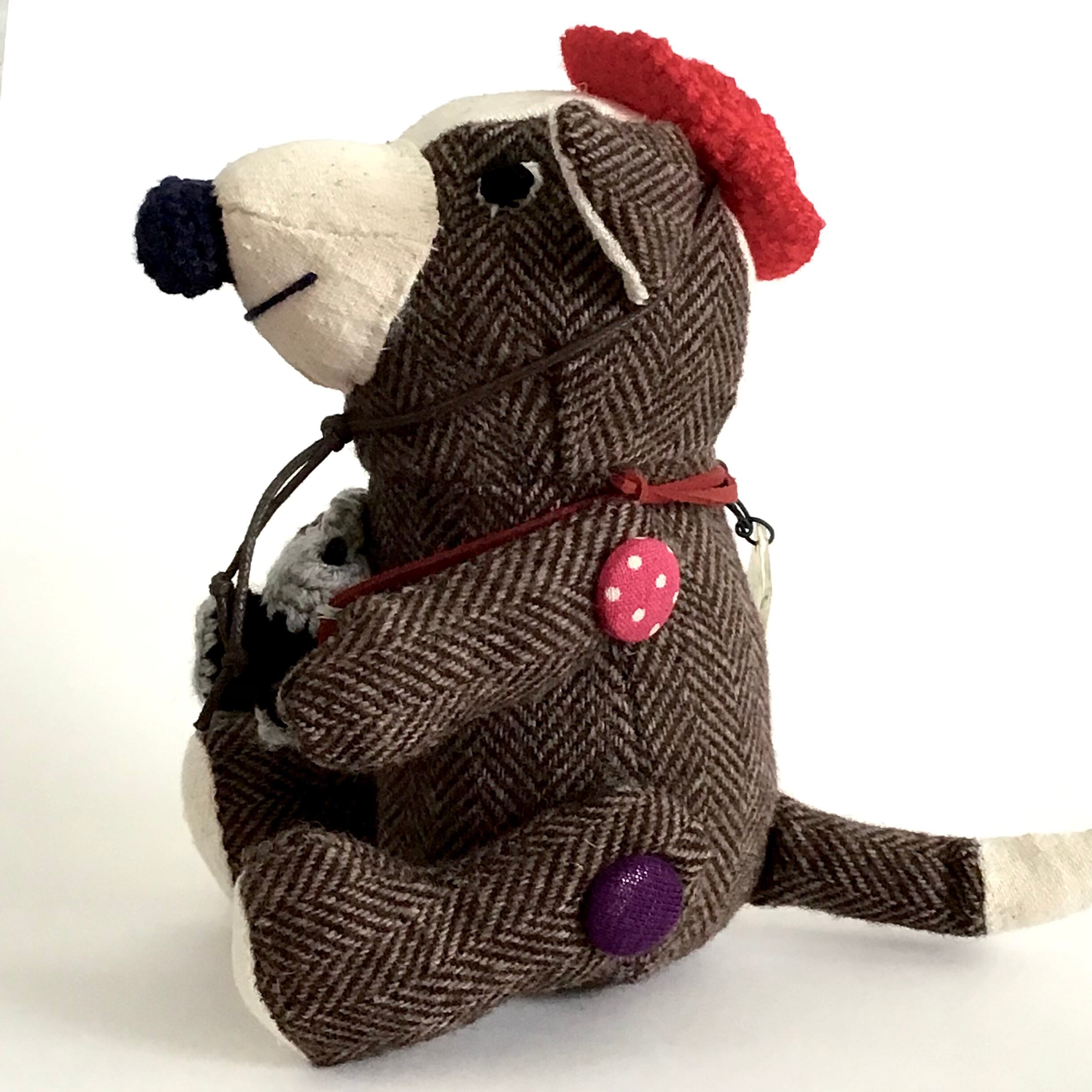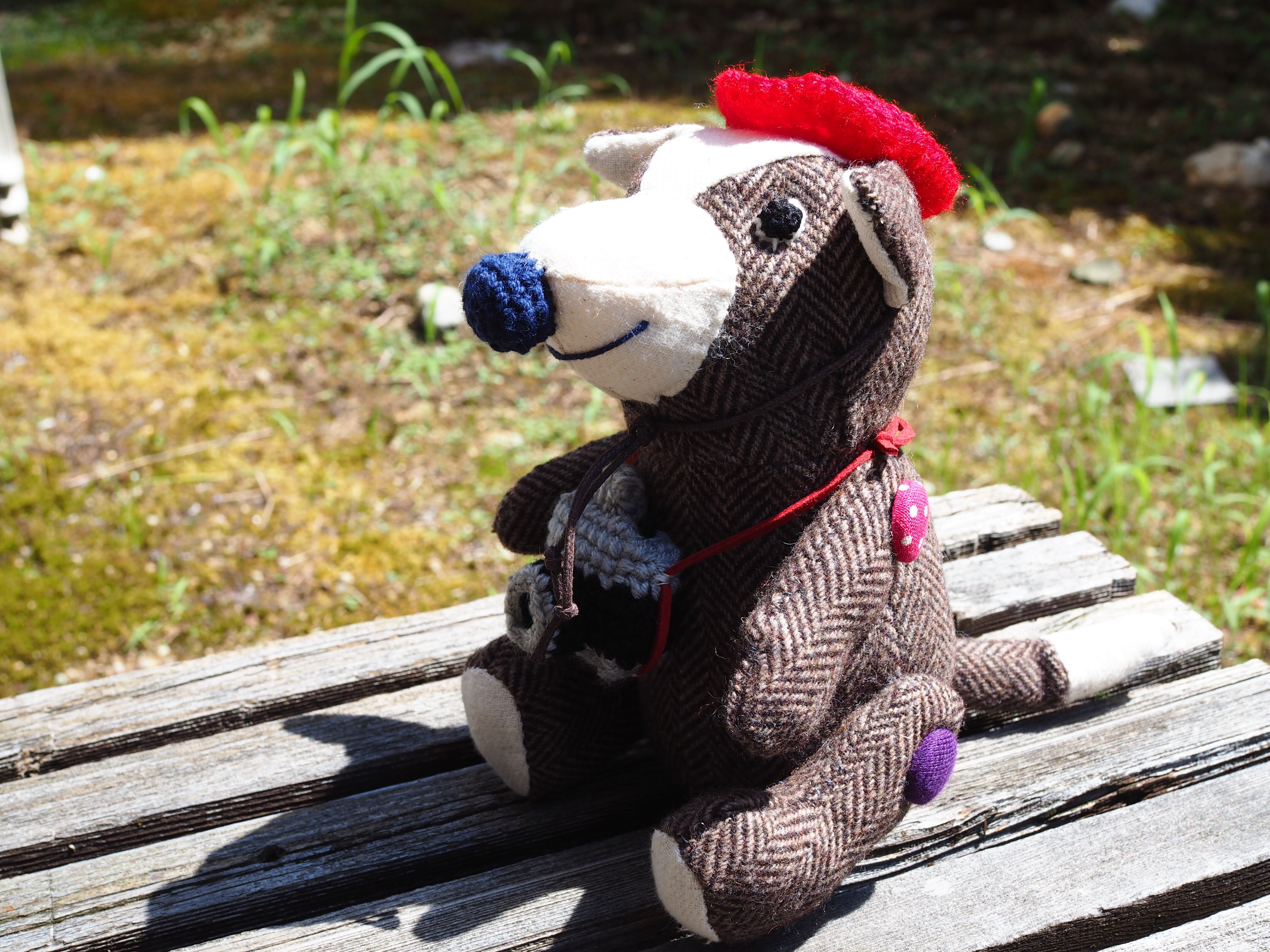 トラッド風な茶系の布のボディ、手足にはカラフルなくるみボタンがついています。