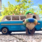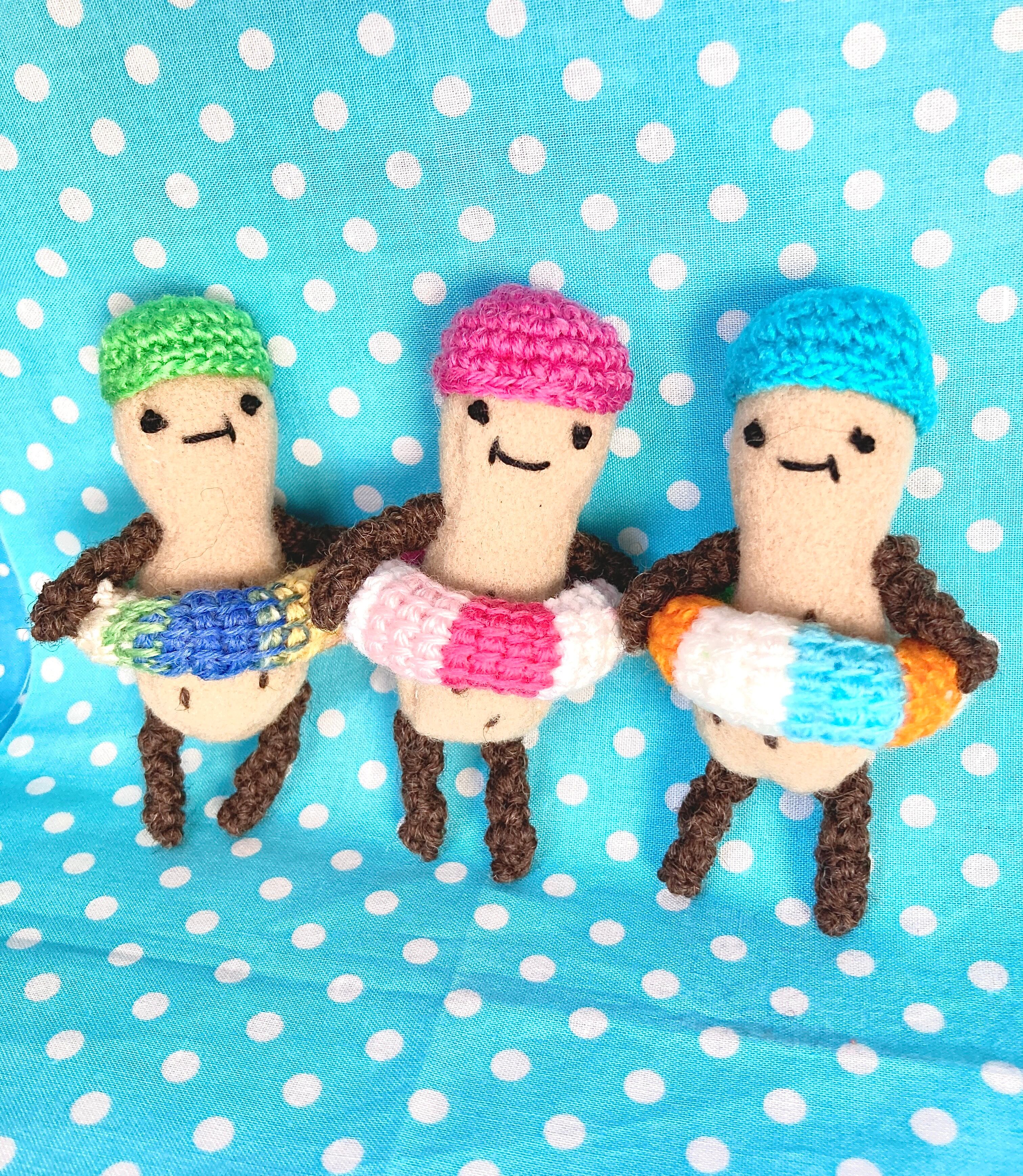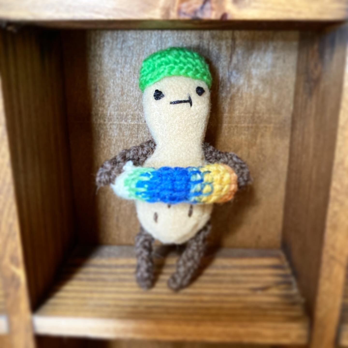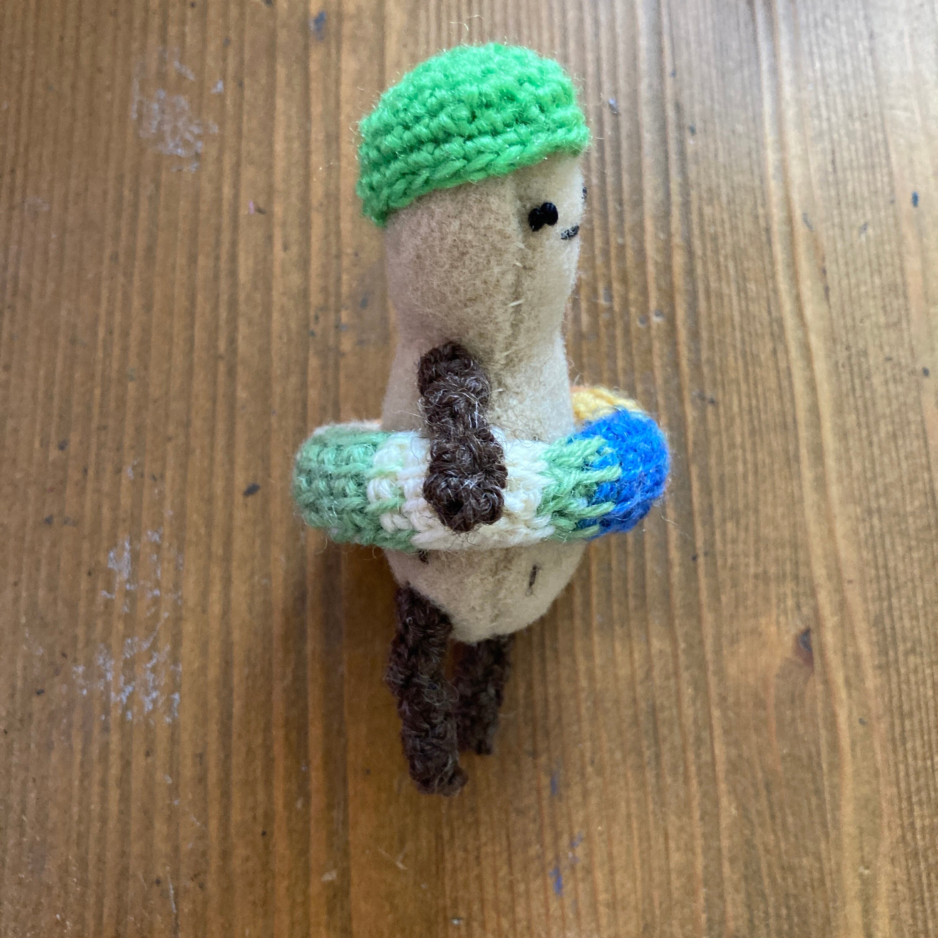 こちらはグリーンのキャップのピーナッツです。浮き輪はグリーン、青、黄、オレンジ、白などのカラフルですが優しいトーンの段染めの糸を使用してアフガン編みで作っています。