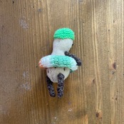 ボディはウールの布製で、他は毛糸やレース糸でできています。全て手編み、手縫いで制作しています。