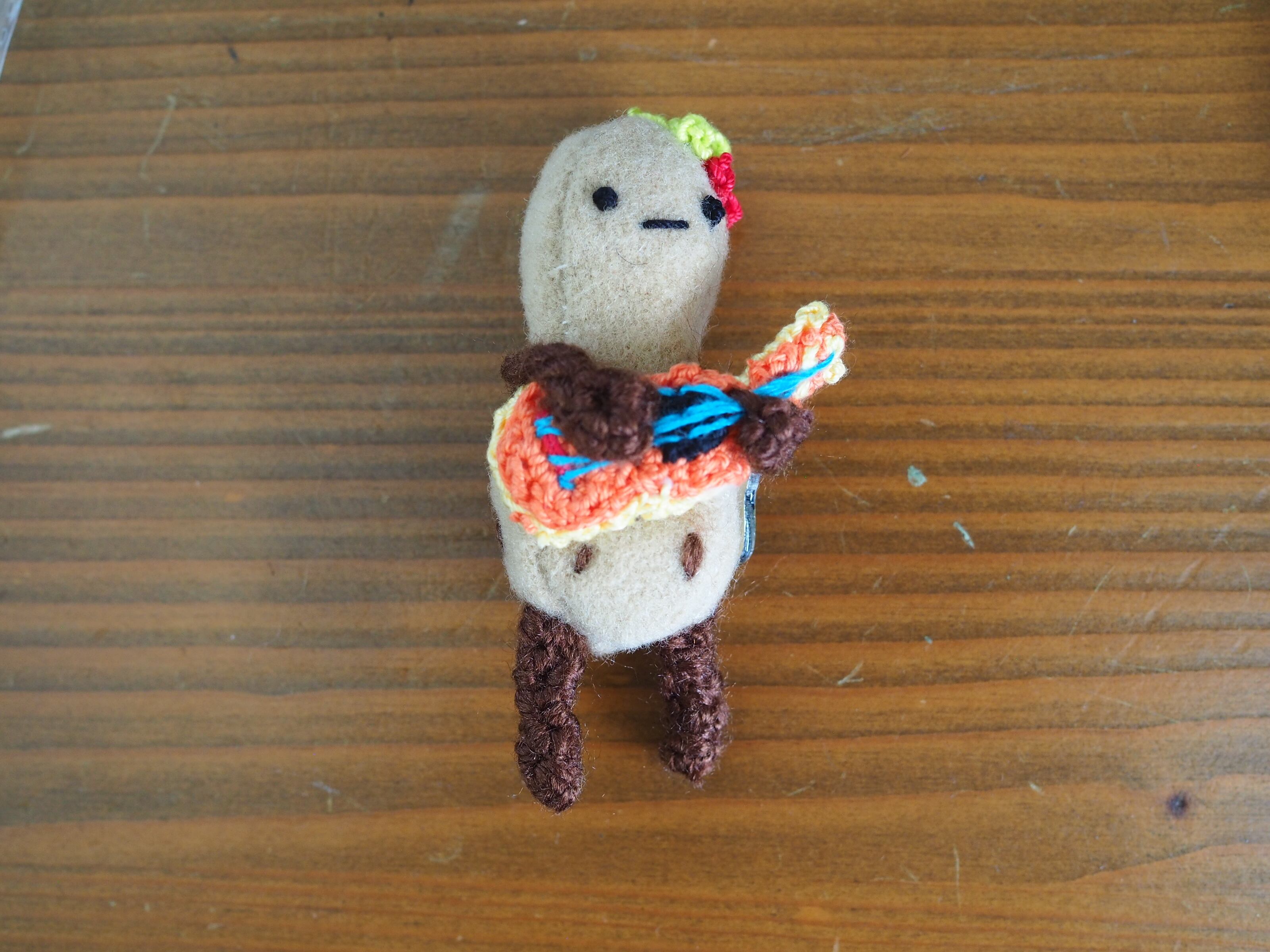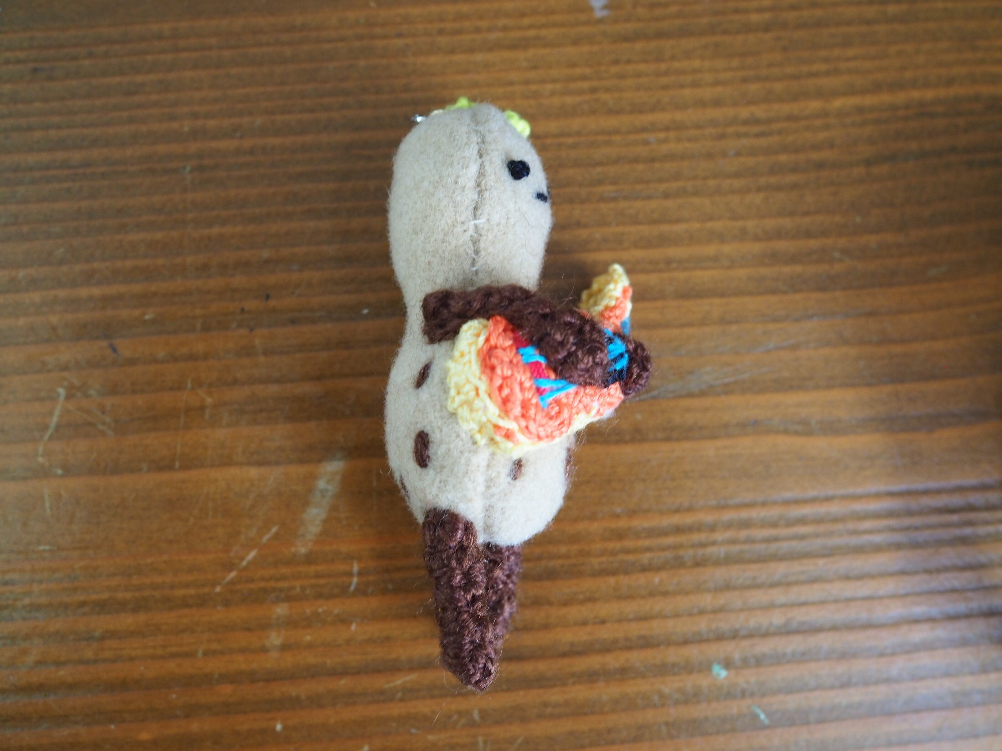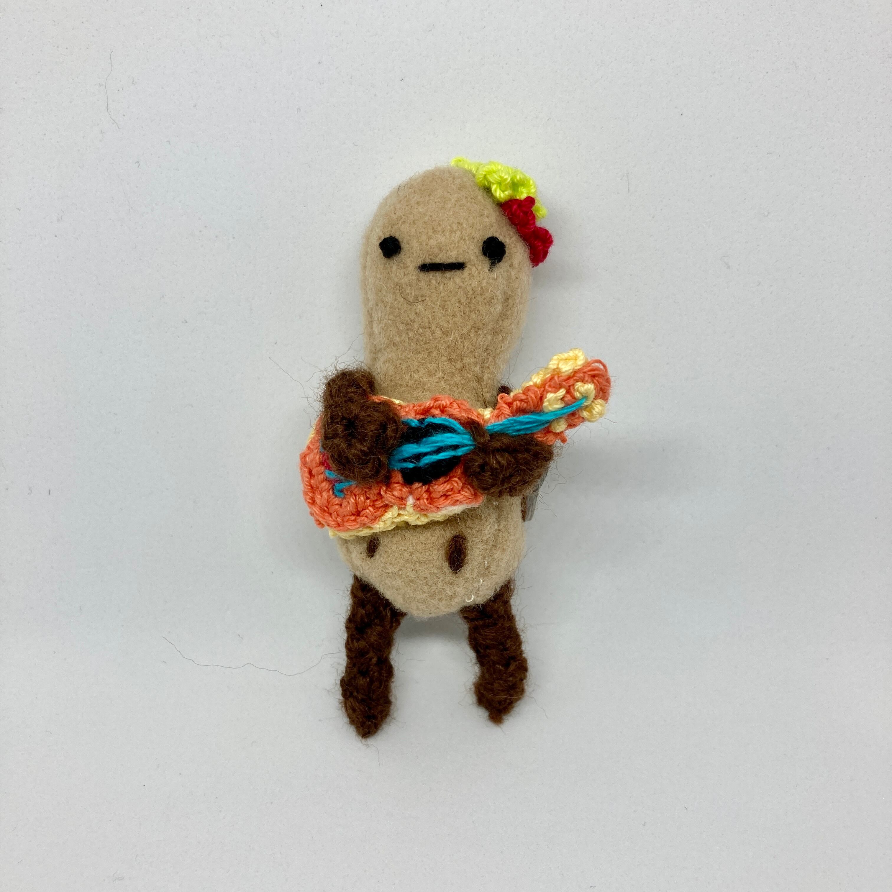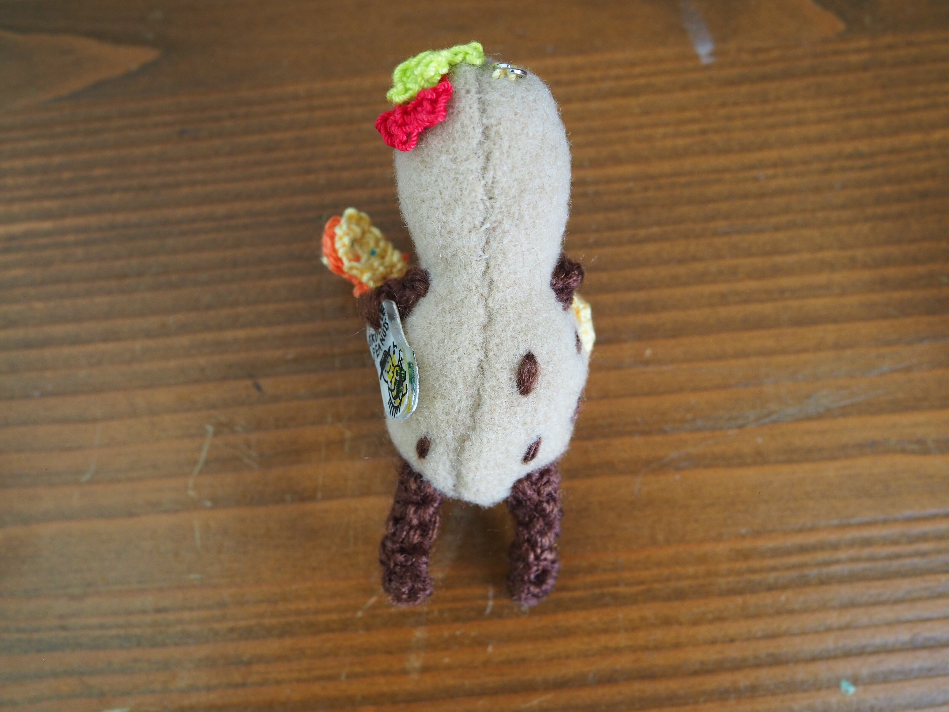 ピーナッツ部分はフェルトのようなウールの布地です。ウクレレやお花はレース糸、手足は毛糸でできています。