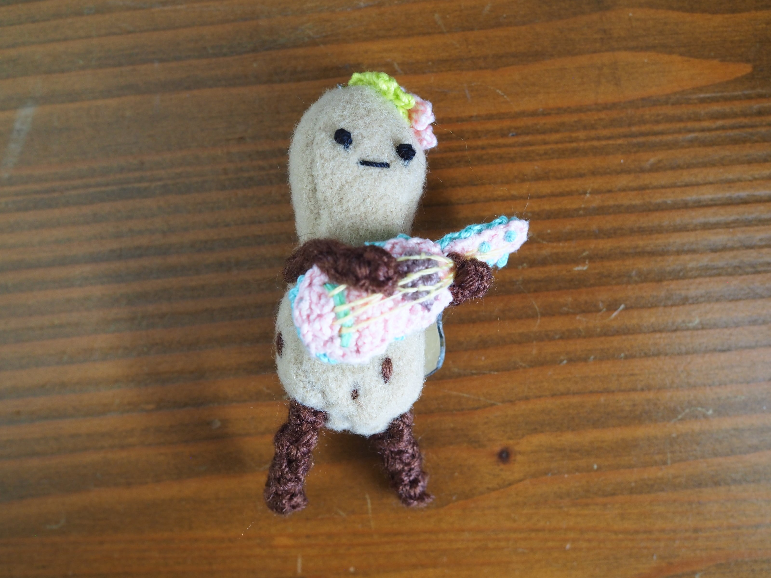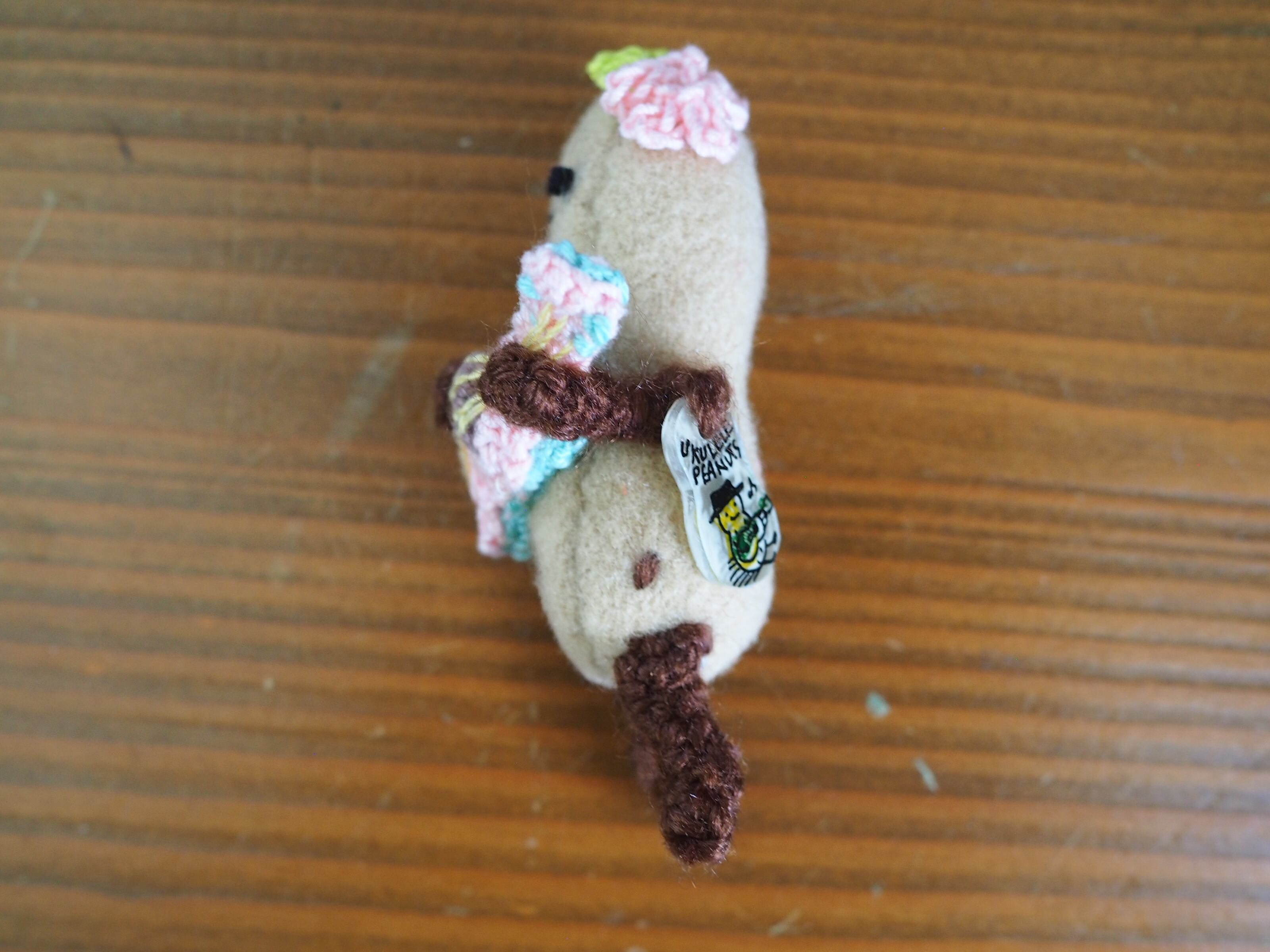 ピーナッツ部分はフェルトのようなウールの布地です。ウクレレやお花はレース糸、手足は毛糸でできています。